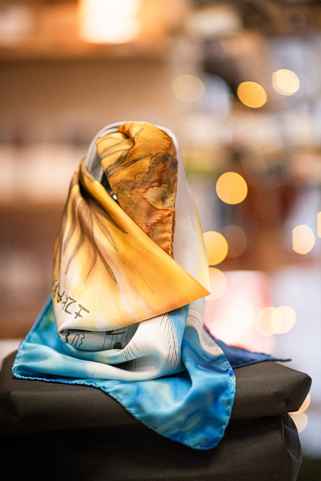 Chaque dessin ou jeu de couleur est réalisé dans mon atelier. Les maquettes sont créés à l'aquarelle. Le foulard est peint à la main. Les motifs uniques ont toujours une histoire à vous raconter.